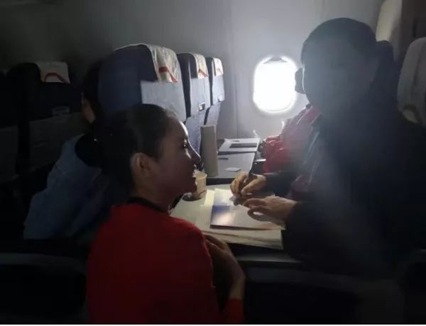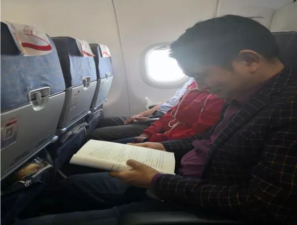 飛機上,窗外的雪景讓人動心。窗內的景致也讓人動情——曾良策校助、邢斌老師、楊乾海老師、黃俊老師都利用碎片時間看書。特別讓我們感到神奇的是,飛機上一位素不相識的空姐,看到認真閱讀的曾校助,居然非常崇拜地蹲下來求他簽字留言,成為曾校助又一個空姐粉絲。